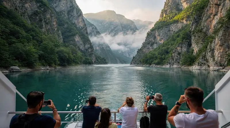If you take an organized tour, you will likely stop at the Shala River — a side canyon that feeds into Lake Koman roughly halfway along the route. A smaller boat takes you up the Shala for about twenty minutes to a point where the canyon walls close in and the water turns the color of a swimming pool. You can swim here, which in warm weather is one of the finer experiences available in the Albanian Alps.