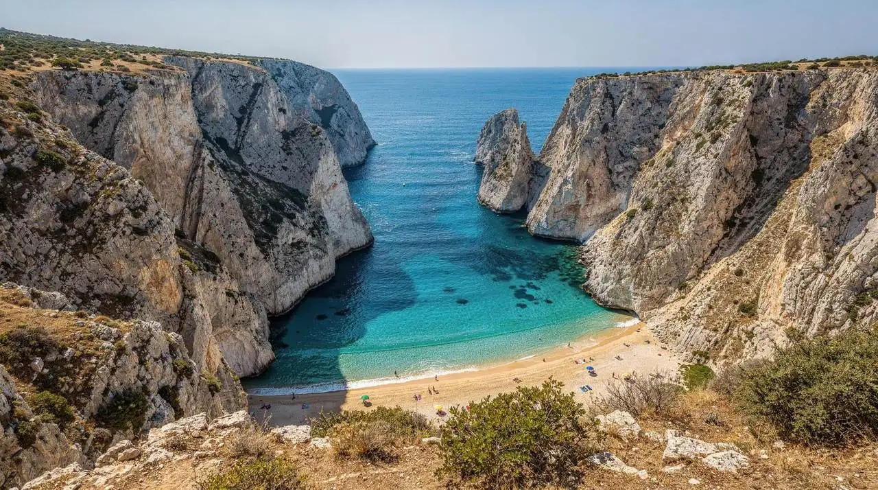 Gjipe is a small cove at the mouth of a limestone canyon, tucked between sheer white cliffs that plunge directly into the Ionian Sea. No road reaches it. To get there you hike through scrubland and down a dramatic gorge, or you take a boat from a nearby bay. The canyon walls tower overhead, filtering the light and creating an atmosphere that feels genuinely removed from the rest of the world. The water is a colour you will try to describe when you get home and find you cannot, exactly.