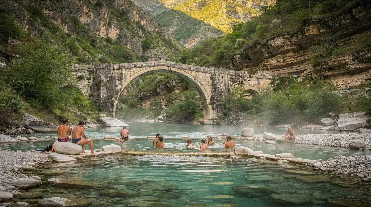 The setting amplifies everything. The pools have been developed with basic stone terracing but remain essentially natural — there are no changing rooms or lockers, just water, rock, and the gorge above you. The canyon walls tower on either side and the Langarica runs cold and clear a few metres away, allowing for a bracing cold-water plunge as a counterpoint to the thermal soak. The combination of hot spring immersion and cold river plunge is one of the more pleasurable physical experiences available in Albanian travel.