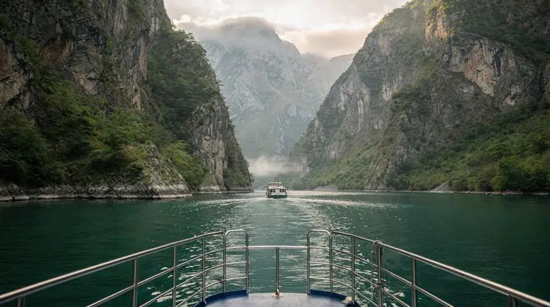Rise early. A shared taxi from Shkodra to the Koman ferry terminal takes about 1.5 hours (1,000–1,500 lekë, arranged through your guesthouse or at the bus station). The ferry ride from Koman to Fierza takes approximately 2.5 hours through what is genuinely one of the most spectacular landscapes in Europe: a narrow reservoir carved into the limestone mountains of northern Albania, with sheer cliffs rising from the water, abandoned villages visible on ledges high above, and an atmosphere that is completely unlike anywhere else.
